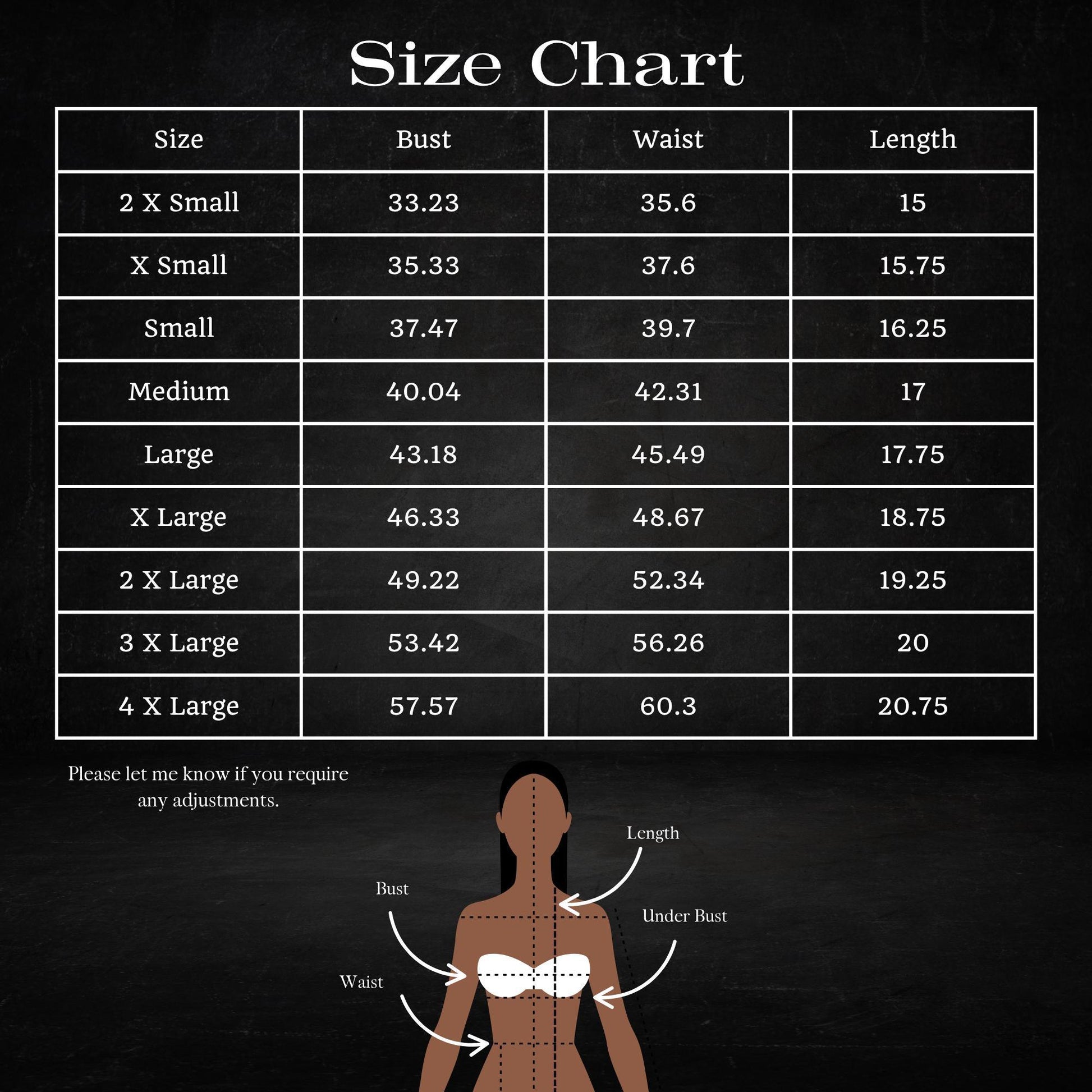- You can adjust between two sizes if you find yourself in between, such as needing a medium in one area and a large in another, or if your measurements fall midway between the two sizes. Additionally, you can adjust the length of the bodice by adding or subtracting fabric as needed.